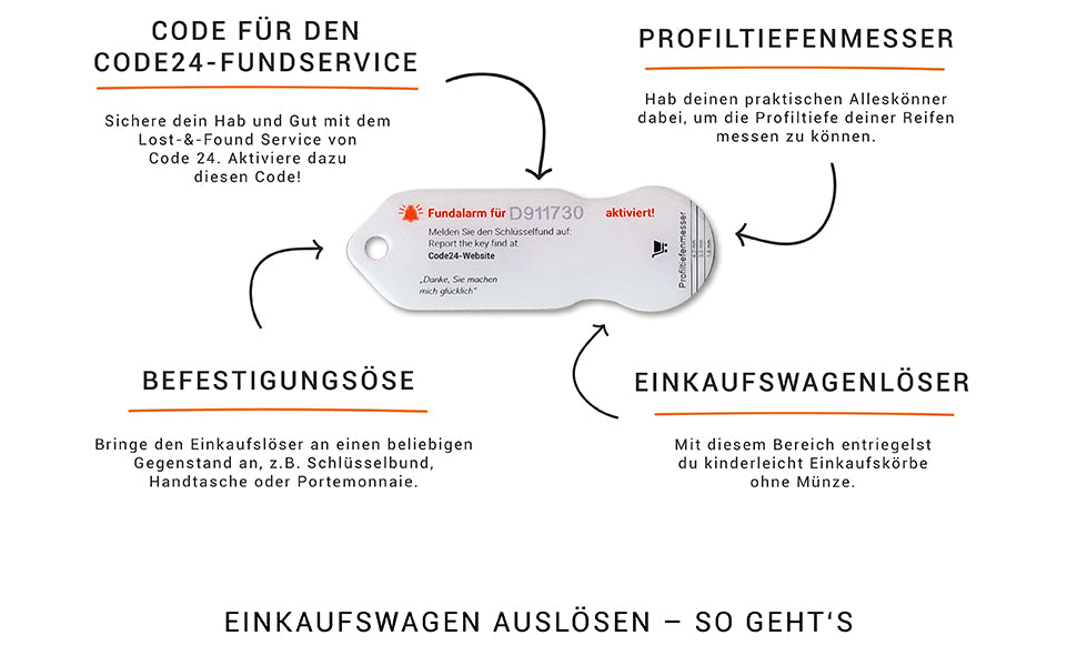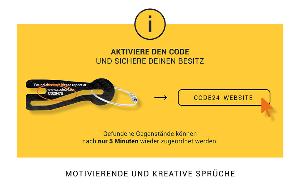 Schützen Sie Ihr Eigentum vor Verlust. Mit Code24 markierte Gegenstände wie Schlüssel, Handtaschen oder Telefone können über einen individuellen Code registriert werden. So sind sie im Verlustfall und bei einem Fund über Code24 Ihrem Besitzer wieder zuordenbar. Über die Code24-Plattform wird ein schneller Kontakt zwischen Finder und Verlierer ermöglicht, um den verlorenen Gegenstand zu seinem Eigentümer zurückzuführen. Dabei ist das erste Jahr Fundservice für Sie gratis und der Schutz anschließend jederzeit verlängerbar.